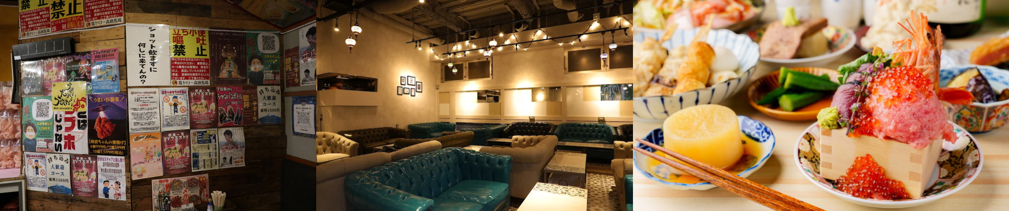 (左から)《鶏ヤロー》の店内に所狭しと貼ってあるポスターはカオス/FS.shake《C.STAND》は洒落た店内で飲食レベルの接客を提供する(写真は新宿三丁目店)/《おすすめ屋PREMIUM》は海鮮系を強化しZ世代より上の層へ訴求する