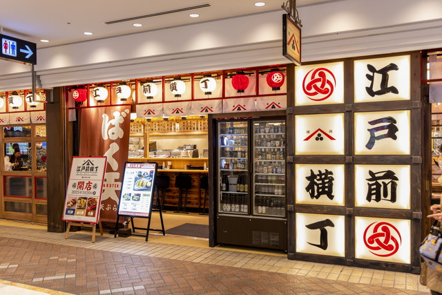 - 横浜の《江戸前横丁》には寿司、鰻、 天ぷらの3業態が並び、他店のメニュ ーも一部注文できる
