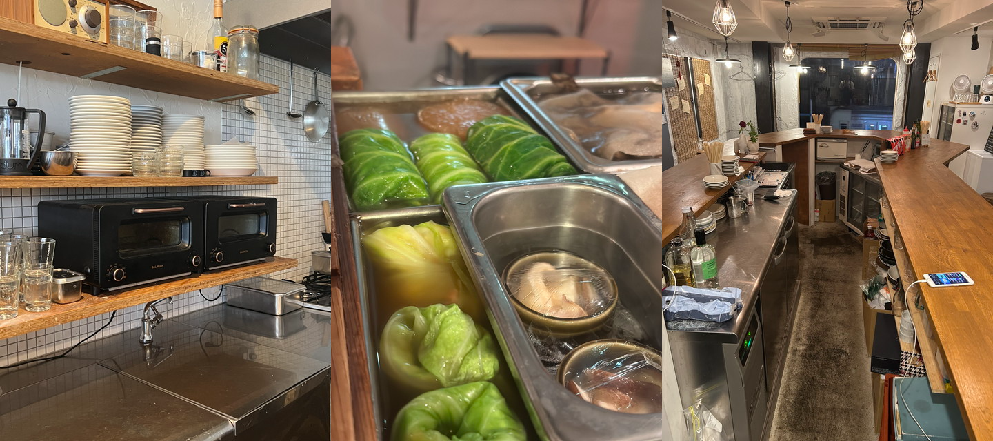 (左)《1 ROOM COFFEE》の厨房ではできるだけ作業スペースを確保し、何かをする時にスペースを空ける作業が発生しないようにしている/(中央)《風見堂》では、おでん器にホテルパンで別室を作り、湯煎や違う料理の保温に使用/(右)《日常酒飯人》の、将来的には食洗機も設置できる厨房